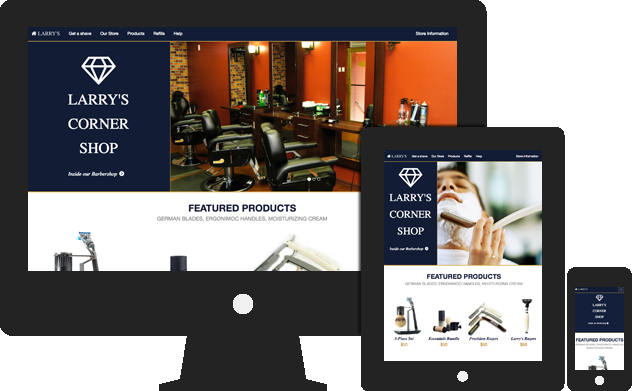The Larry's Corner Shop Demo features a clean lines and striking colors. A store information modal makes critical information easily accessable, and product spotlights line the bottom of the website.