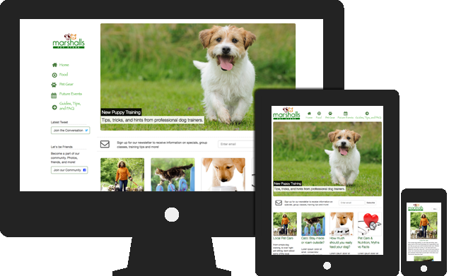 The Pet Store Demo is a bright and coloful website. The navigation menu switches from a sidebar to a top menu for easy navigation, and a newletter signup and social media links promotes community engagement.